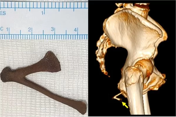 Uma tomografia pélvica mostrou que a parte mais curta do osso estava projetada para fora do ânus, enquanto a mais longa ficou dentro do canal anal, mas sem causar lesões.