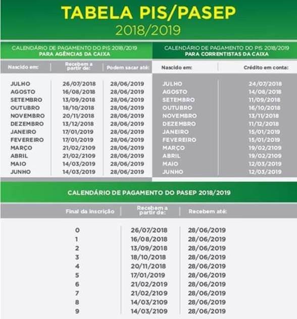 O Abono Salarial ano-base 2017 começou a ser pago em julho de 2018. O calendário de recebimento leva em consideração o mês de nascimento, para trabalhadores da iniciativa privada, e o número final da inscrição, para servidores públicos (veja tabela abaixo). O prazo final de recebimento para todos os trabalhadores com direito ao benefício é 28 de junho de 2019.