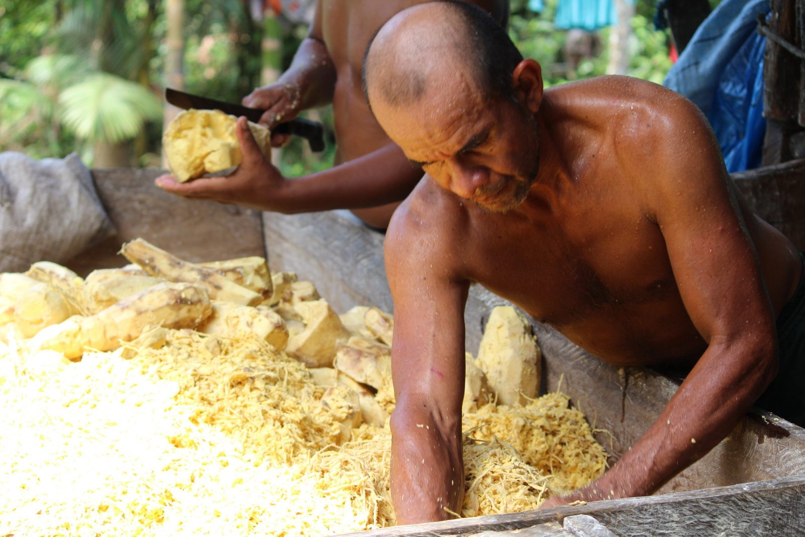 A agricultora explicou que após arrancarem as raízes da mandioca, as “decotam” (cortam), colocam dentro de sacos de 50 quilos (saco de trigo), carregam até o igarapé, onde passa o período de quatro dias de molho (dentro da água).