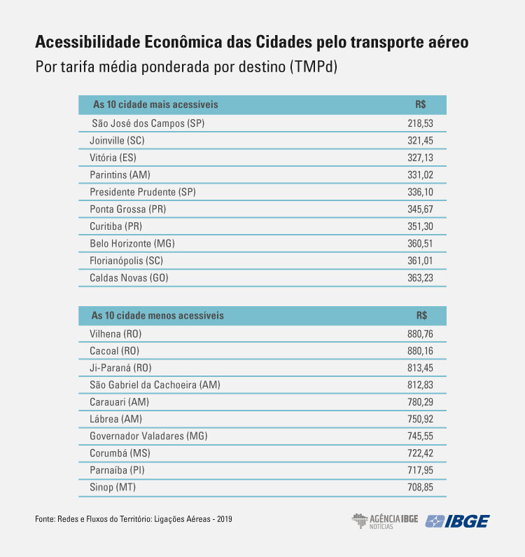 Os dados fazem parte do estudo Redes e Fluxos do Território: Ligações Aéreas (2019-2020), divulgado hoje (10) pelo IBGE. O produto também está disponível na Plataforma Geográfica Interativa (PGI), onde o usuário pode fazer seus próprios cruzamentos e baixar as tabelas e mapas.