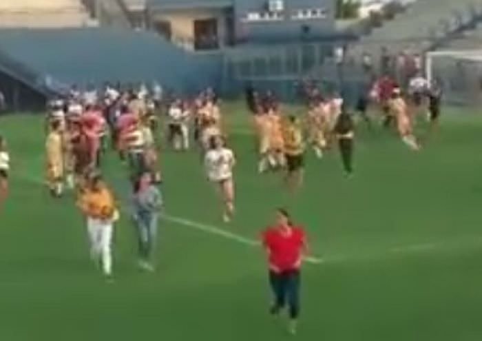 A confusão assustou os torcedores. O bandeirinha saiu em disparada no momento da briga.