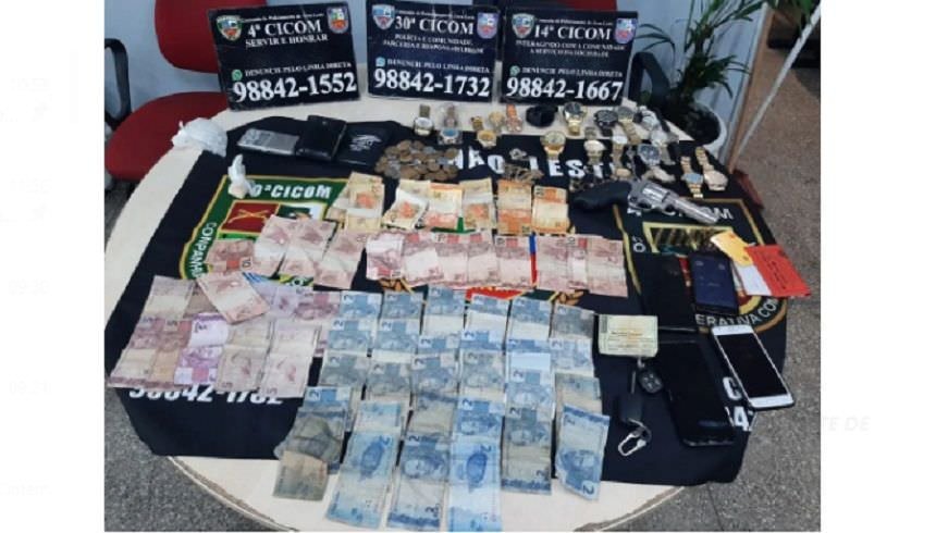 Os itens que foram apreendidos pelos policiais foram um revolver calibre 38, 6 munições, 16 relógios, 3 celulares, alem de 5 cordões.