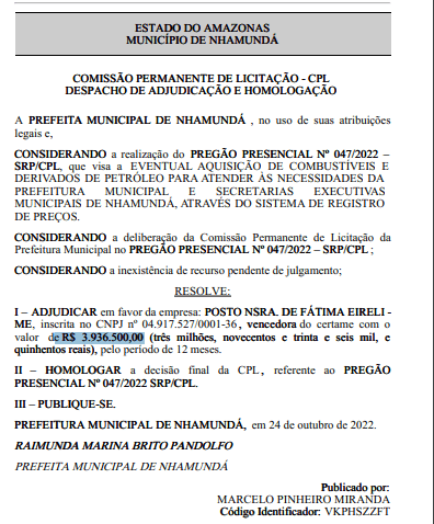 A prefeita Raimunda Marina Brito Pandolfo vai gastar R$3,9 milhões com aquisição de combustíveis e derivados de petróleo, para atender às necessidades da Prefeitura e secretarias executivas de Nhamundá, a 382 quilômetros de Manaus.