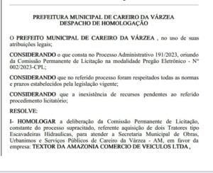 Para prestar os serviços, o prefeito contratou a empresa Textor da Amazônia Comércio de veículos Ltda, inscrita no CNPJ sob n° 42.247.180/0001-