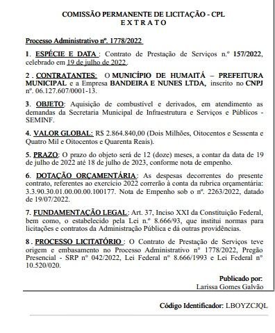 A informação foi divulgada na manhã desta terça-feira, 7, no Diário Oficial da Associação Amazonense dos Municípios (AAM). O documento foi publicado por Larissa Gomes Galvão, através do código identificador: LBOYZCJQL.