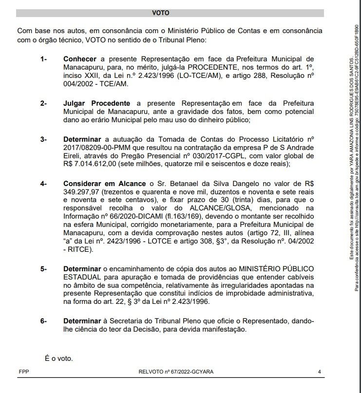 “Em linhas gerais o representante aduz que Betanael da Silva D’Ângelo está envolvido em casos de ilegalidade e má gestão no âmbito da Prefeitura de Manacapuru, usou de contratação direta, dispensando processo licitatório sem prévia comprovação de excepcional interesse público, contratou diversos serviços com determinadas empresas sem haver motivação para tal, dentre outras possíveis irregularidades, solicitando após as devidas apurações que sejam aplicadas as sanções cabíveis”, diz parte do documento.