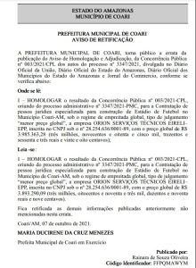 O Diário Oficial dos municípios do Amazonas publicou a informação, nesta sexta-feira (8). A prefeita em exercício, Maria Ducirene da Cruz Menezes, assinou o Aviso de Homologação.