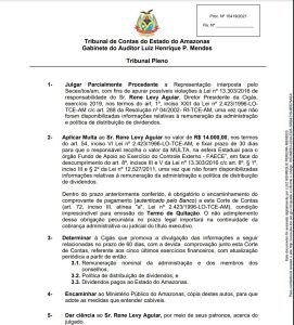“Aplicar Multa ao Sr. Rene Levy Aguiar no valor de R$ 14.000,00, nos termos do art. 54, inciso VI Lei nº 2.423/1996-LO-TCE-AM, e fixar prazo de 30 dias para que o responsável recolha o valor da MULTA, na esfera Estadual para o órgão Fundo de Apoio ao Exercício do Controle Externo – FAECE”, em face do descumprimento do art. 8º, incisos III e V da Lei nº 13.303/2016 c/c art. 8º, § 1º, inciso III e § 2º da Lei nº 12.527/2011, uma vez que não foram disponibilizadas informações relativas à remuneração da administração e política de distribuição de dividendos”, diz parte do documento.