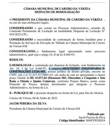 A Câmara Municipal de Careiro da Várzea, a 23,4 quilômetros de Manaus, vai pagar R$16,8 milhões à empresa para prestação de serviços de elevação de tablado.