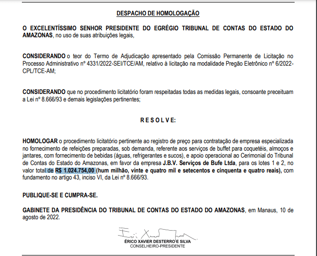 O Tribunal de Contas do Estado do Amazonas (TCE-AM) vai gastar mais de R$1 milhão com contratação de empresa especializada em refeições preparadas, referente aos serviços de buffet para coquetéis, almoços e jantares, com fornecimento de bebidas (águas, refrigerantes e sucos), e apoio operacional ao Cerimonial do Tribunal.