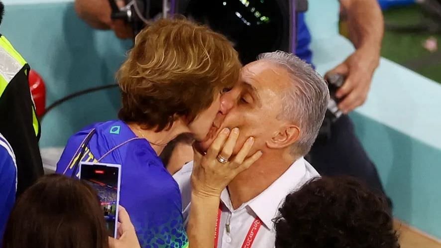 Antes da bola rolar entre Coreia do Sul e Brasil pelas oitavas de final da Copa do Mundo, o técnico da Seleção Brasileira, Tite, foi até as arquibancadas do estádio 974 onde estava a esposa e deu um beijo nela.