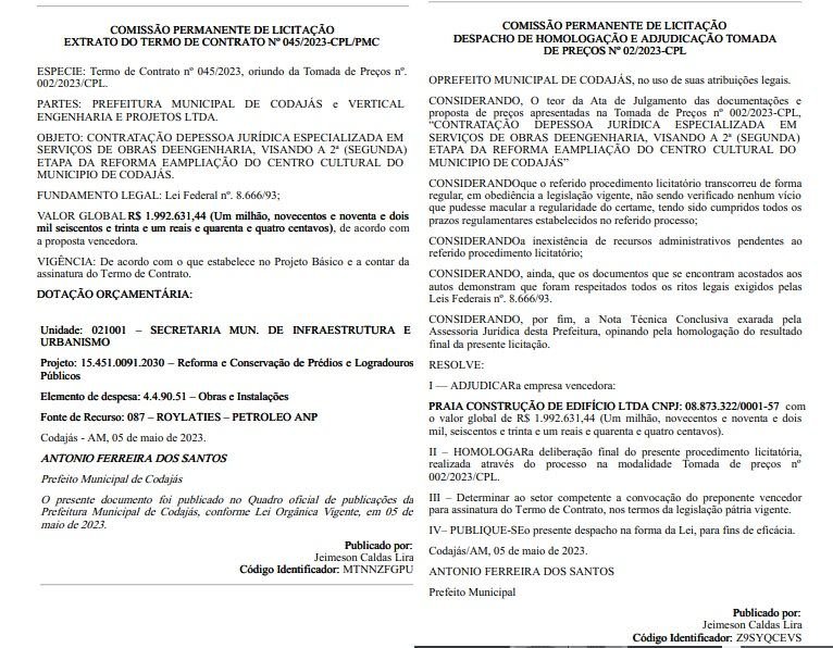 O prefeito Antônio Ferreira dos Santos (Progressistas), conhecido como “Tonho”, pretende gastar quase R$ 4 milhões com contratação de pessoa jurídica especializada em serviços de obras de engenharia, visando a 2ª (segunda) etapa da reforma e ampliação do Centro Cultural de Codajás, a 269 quilômetros de Manaus.