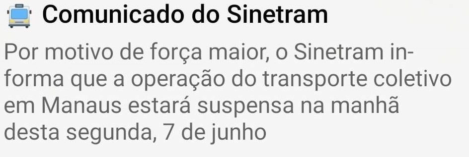 Em nota, o Sindicato das Empresas de Transporte de Passageiros do Estado do Amazonas (Sinetram) informou que por motivos de força maior a operação do transporte coletivo em Manaus será suspenso na manhã de segunda-feira, 7.