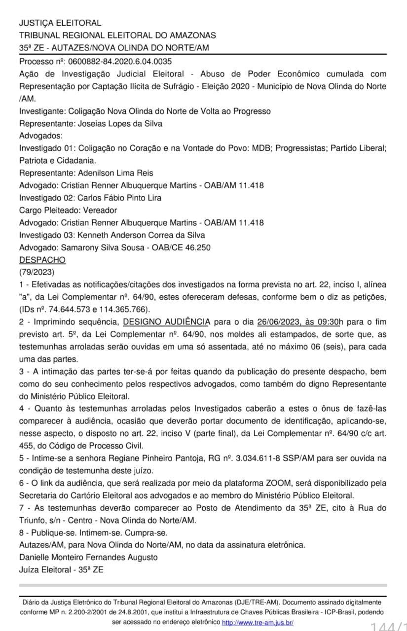 O Tribunal Regional Eleitoral (TRE-AM), marcou para o próximo dia 26, às 9h30, a audiência de custódia sobre o processo de investigação que apura abuso de poder econômico e compra de votos nas eleições de 2020, em Nova Olinda do Norte.