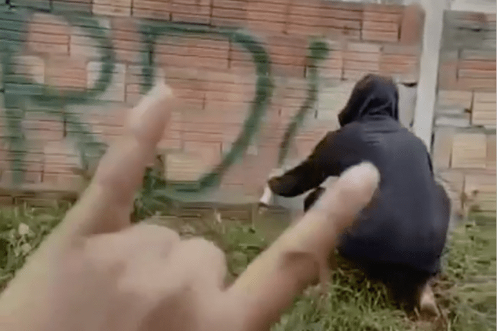 Os indivíduos aparecem pichando um muro com o símbolo da facção e afirmando que quem manda na região, são eles.