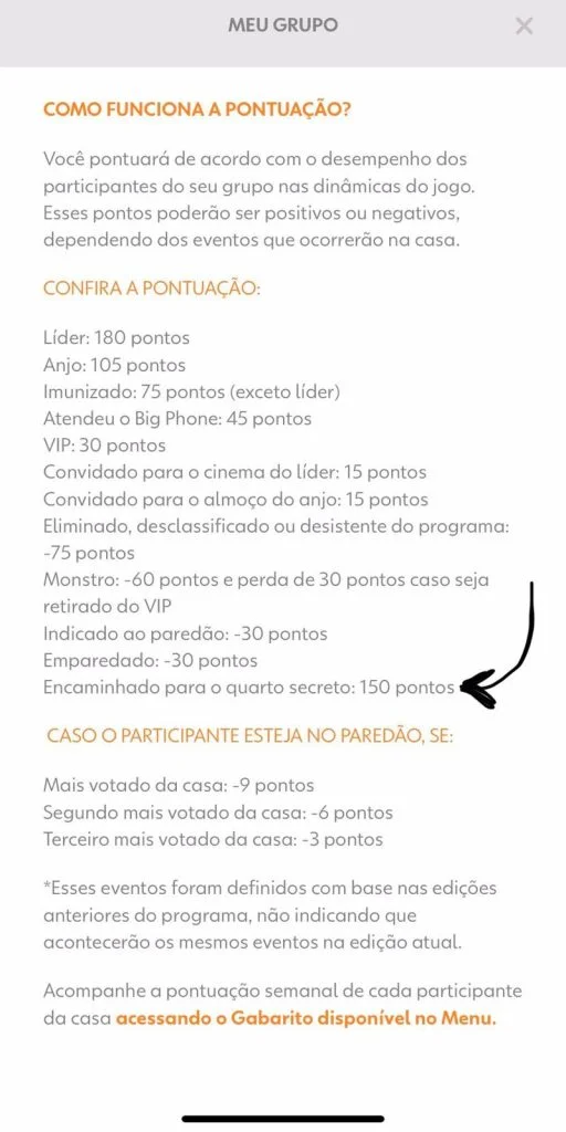O aplicativo oficial do BBB22, Big Game, acabou vazando a existência de um quarto secreto na atual edição do reality. A dinâmica proposta nesta semana aos usuários do app revela que o participante que será encaminhado ao quarto secreto ganhará 180 pontos. Não se sabe ainda quais privilégios ou prejuízos obtidos, a forma da escolha de quem será enviado para o cômodo misterioso e nem se o quarto terá mais de um participante.