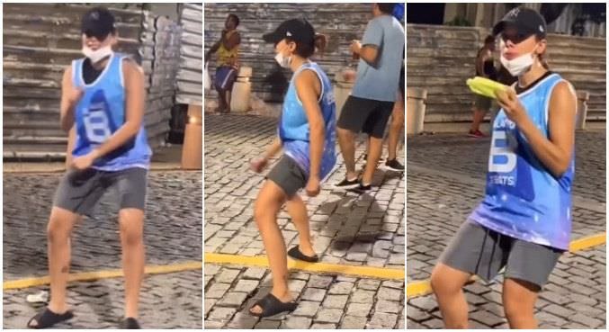 Para aproveitar a folia no meio do público sem ser abordada por fãs, Anitta precisou se disfarçar. Ela usou uma regata comprida, bermuda larga e chinelo, look bem diferente daquele com que está acostumada. Além disso, a cantora prendeu o cabelo, colocou um boné e uma máscara no queixo para esconder um pouco mais o rosto.