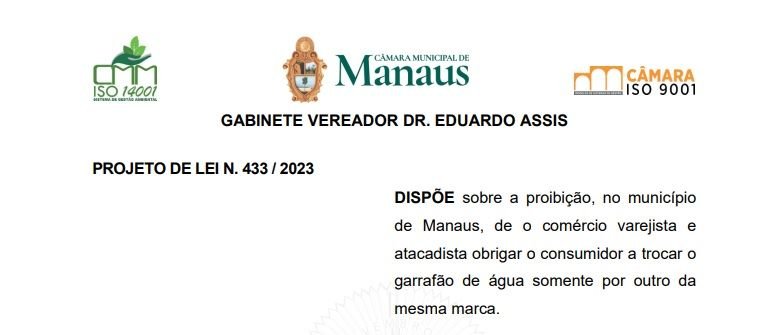 O vereador Eduardo Assis (Avante), quer derrubar uma regra definida pelo Ministério Público Federal (MPF) que renovou um Termo de Ajustamento de Conduta (TAC) do Sindicato da Indústria de Bebidas em Geral do Amazonas e determinou o uso exclusivo de garrafões retornáveis de água.