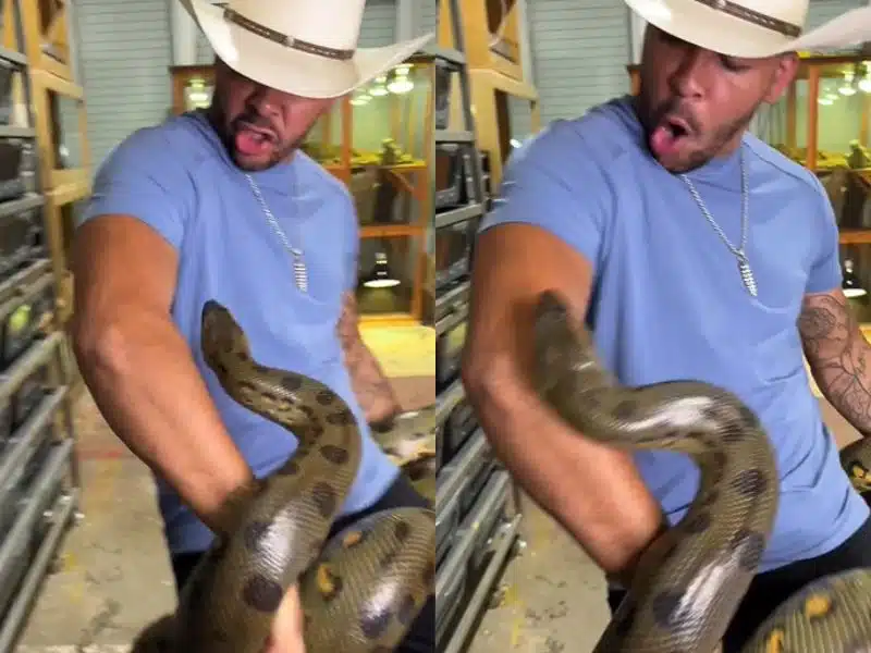 Mundo – O americano Nick Bishop publicou um vídeo nas redes sociais onde está segurando uma sucuri e acaba sendo atacado pelo animal durante uma gravação, feita há duas semanas, em Los Angeles, nos Estados Unidos.