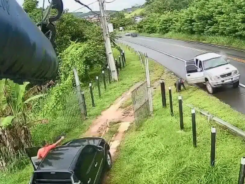 Ao perceber o que ocorria, a mulher corre em disparada, saindo do alcance das filmagens, já o homem, abre a porta do carro, onde estava com a filha de 5 anos, se preparando para a ação.