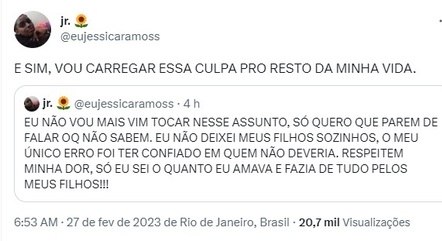 Em sua conta no twitter, Jéssica negou que tivesse deixado as crianças sozinhas.