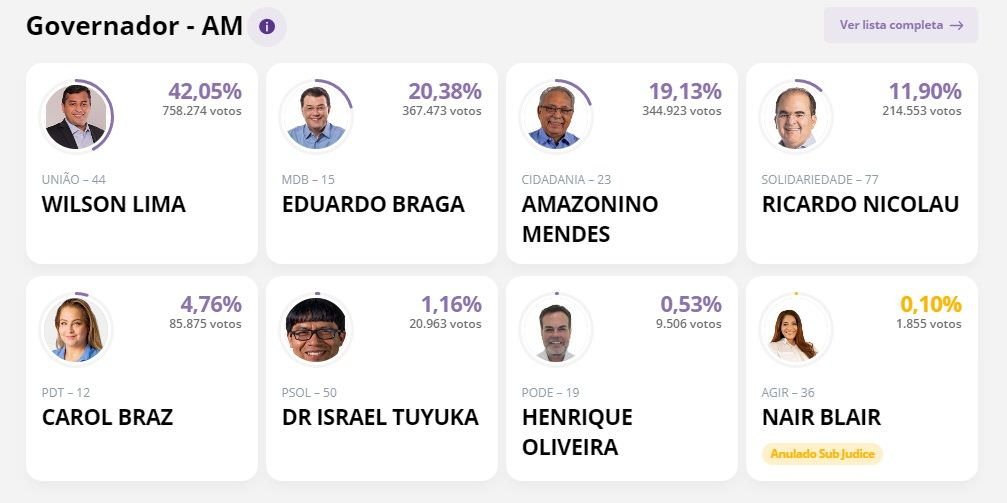 O governador Wilson Lima (UB) e o senador Eduardo Braga (MDB) se enfrentam na disputa pelo comando do governo do Amazonas em segundo turno. Fatando menos de 5% para o fechamento das urnas, Wilson recebeu  42,11% de votos e Braga 20,56%.